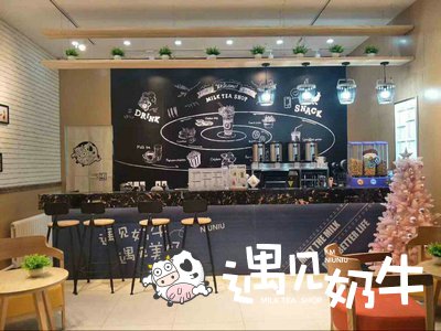 另一方面在奶茶店装饰上也需要配合品牌形象来设计,遇见奶牛加盟店的墙上就有一个很显眼的奶牛图标,正好对应了品牌名称,相得益彰。门头设计上也是用牛仔元素为底,搭配白色文字,犹如鲜奶一般丝滑流淌,也是再次呼应了遇见奶牛的品牌元素。如此一来,就能将奶茶店的形象塑造的更立体,更引人注目。